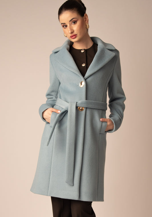 Вталено Дамско Палто от Вълнен микс в Светлосиньо
