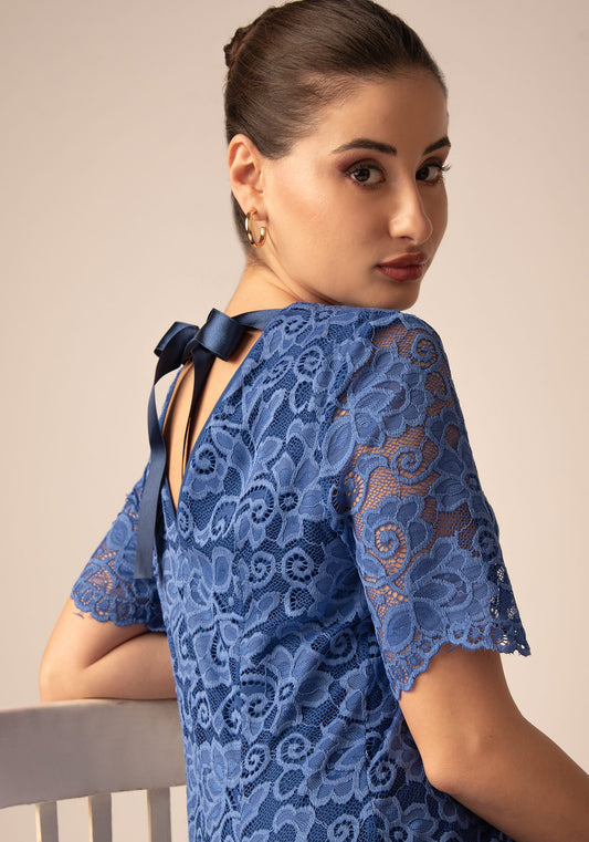 Midi Рокля с Ръкави от Дантела в Синьо