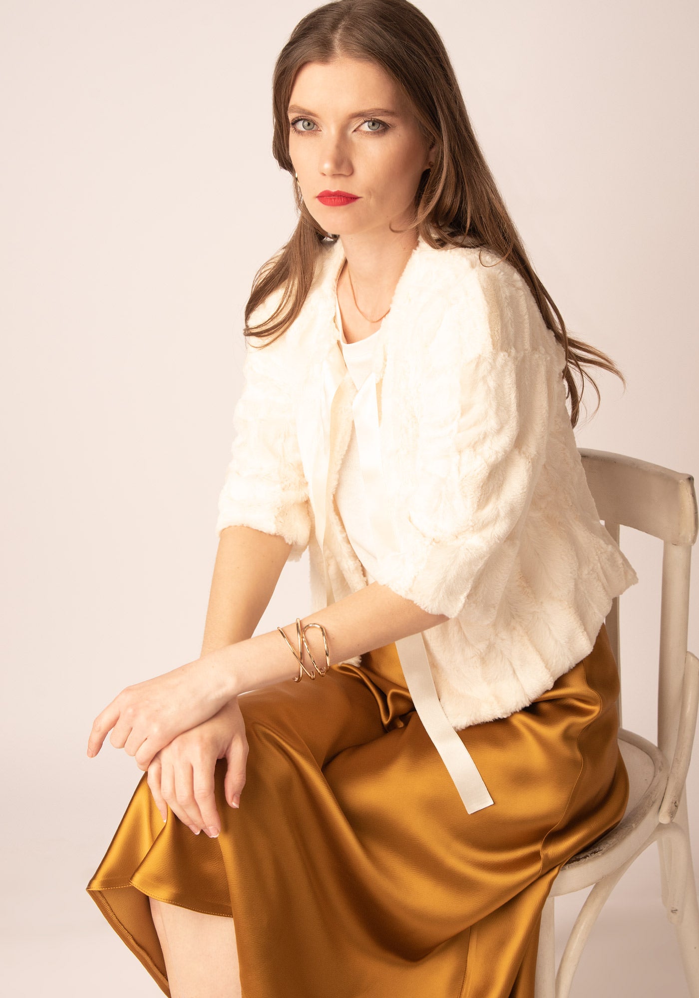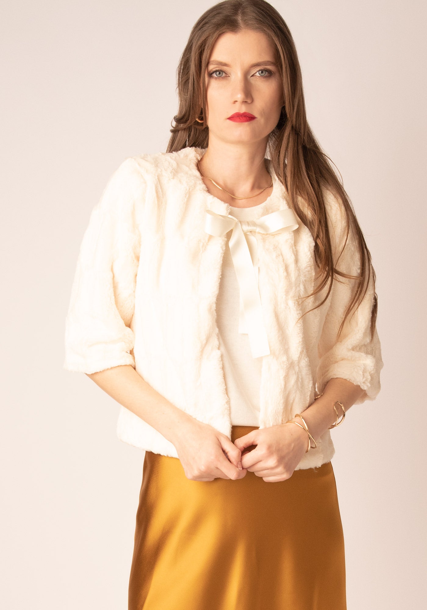 Effortless elegance with a vintage twist – this short faux fur cape is your go-to layering piece for special occasions and beyond. Crafted from luxuriously soft faux fur, it features a relaxed silhouette, elegant ¾ sleeves, and a satin ribbon closure that adds a touch of feminine charm. Perfect over satin dresses or chic separates, it’s a timeless addition to your wardrobe for weddings, evenings out, and festive moments.