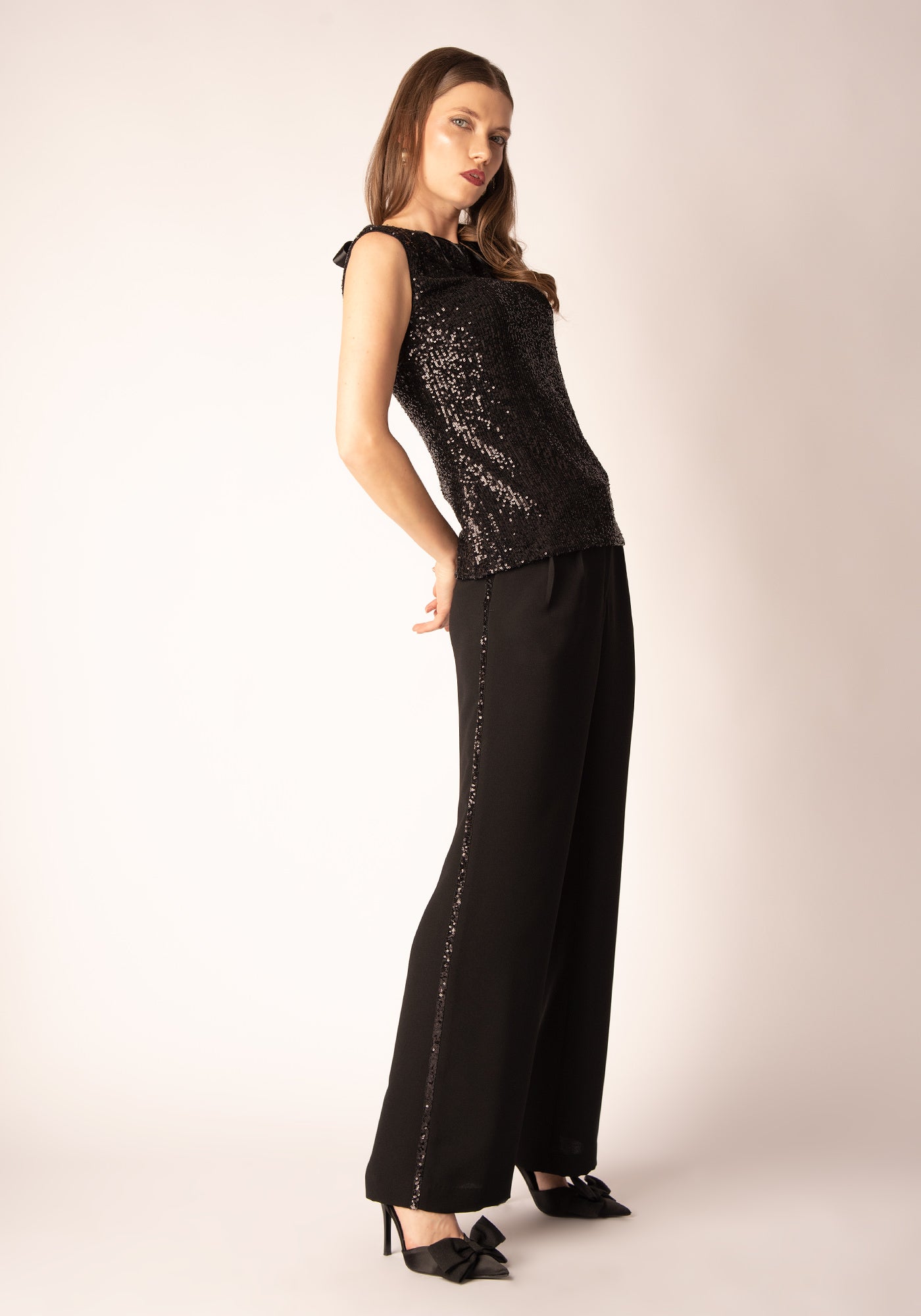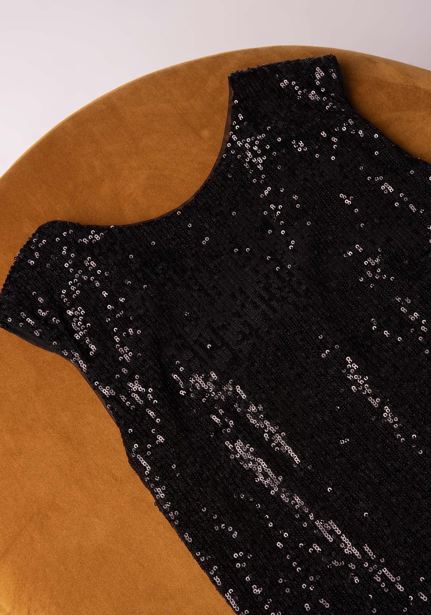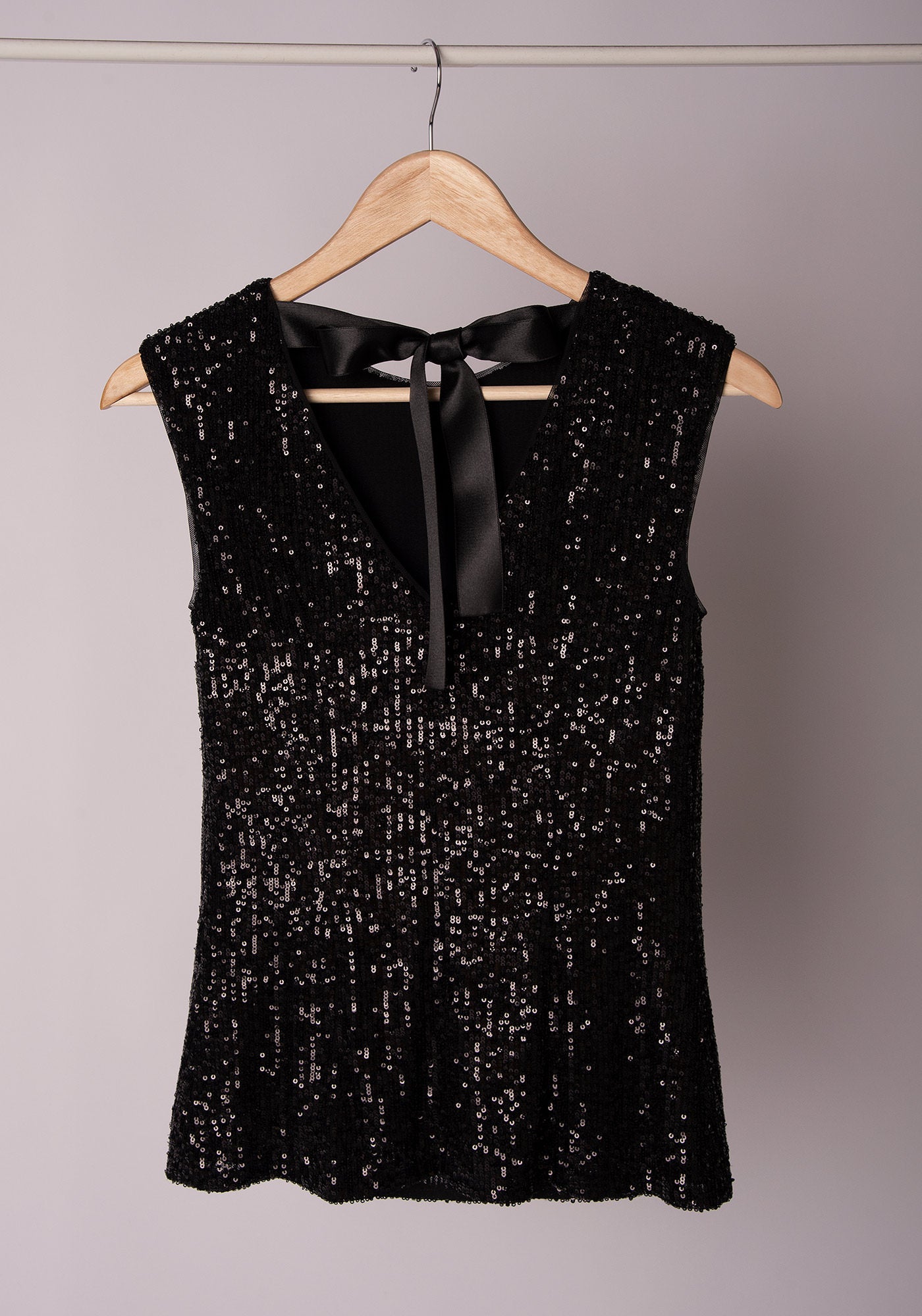 This sequin top pairs seamlessly with all your favourite bottoms making you the shining star at any event. Тhe sparkling sequin dances with your every movement, creating a symphony of lights for the senses. A soft satin ribbon draws attention to the simple but impressive back.