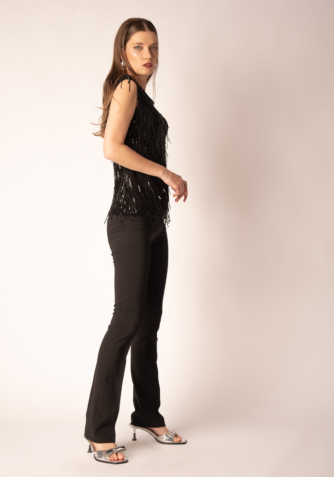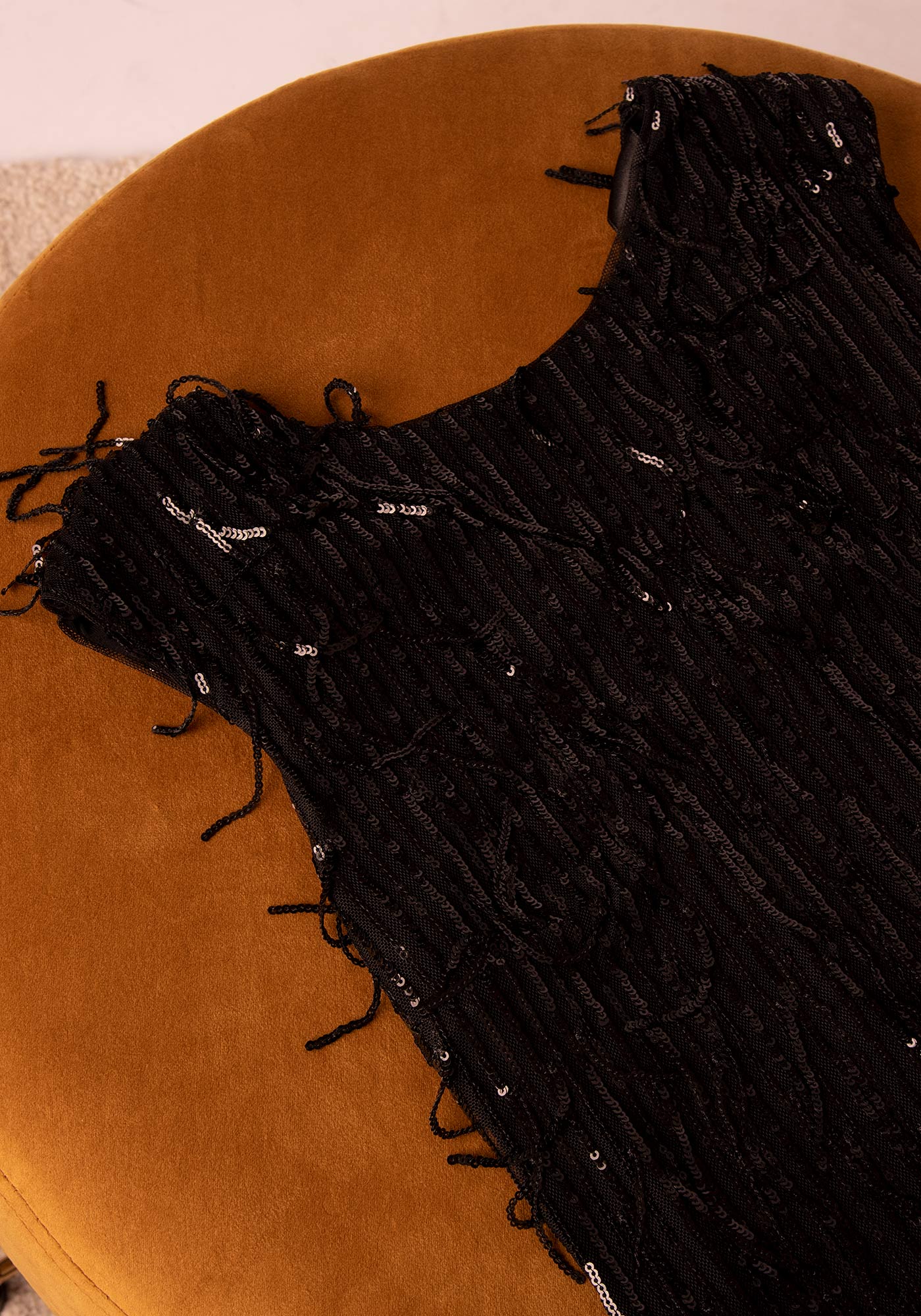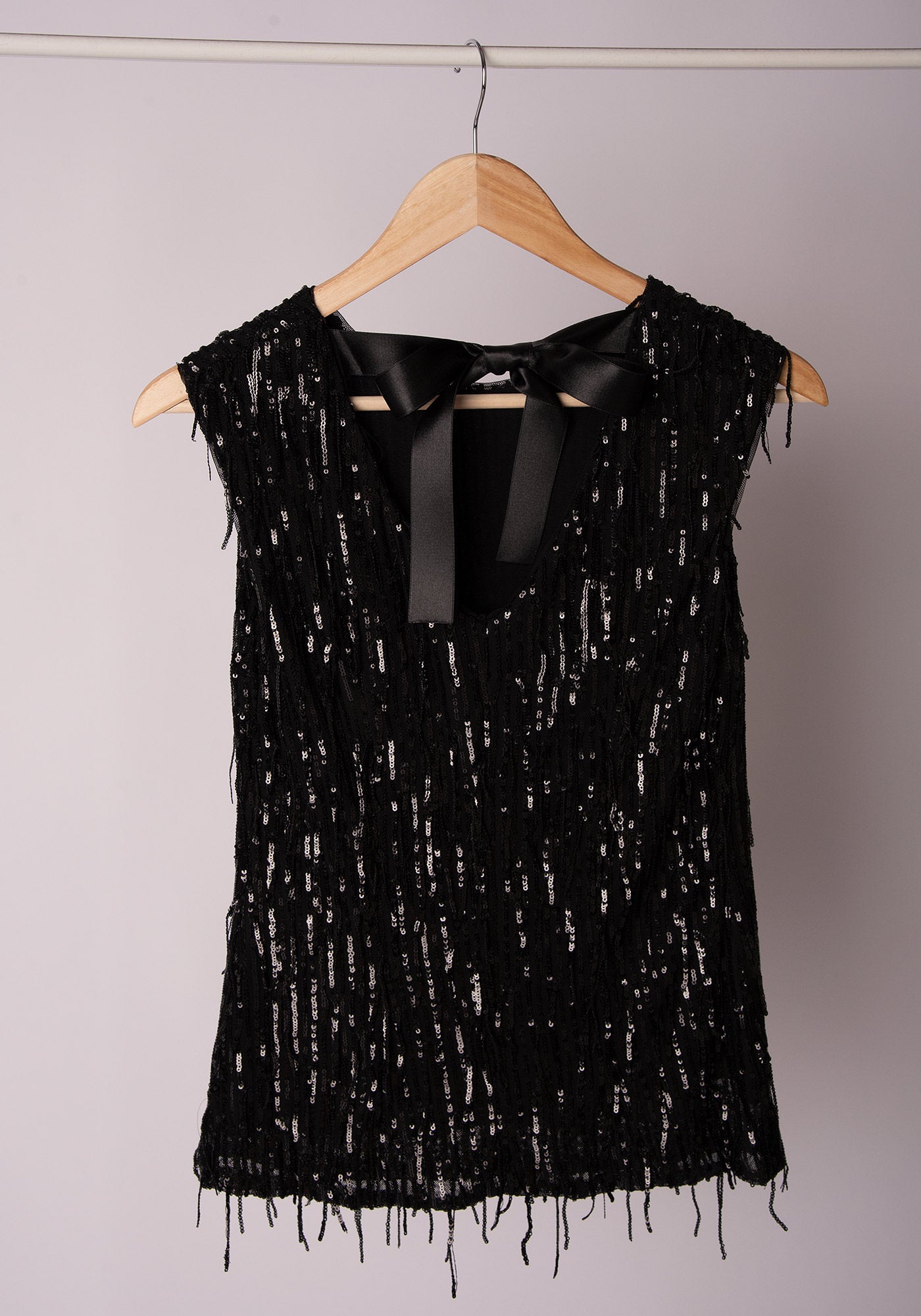 This sequin top pairs seamlessly with all your favourite bottoms making you the shining star at any event. Тhe sparkling sequin fringe dances with your every movement, creating a symphony of lights for the senses. A soft satin ribbon draws attention to the simple but impressive back.