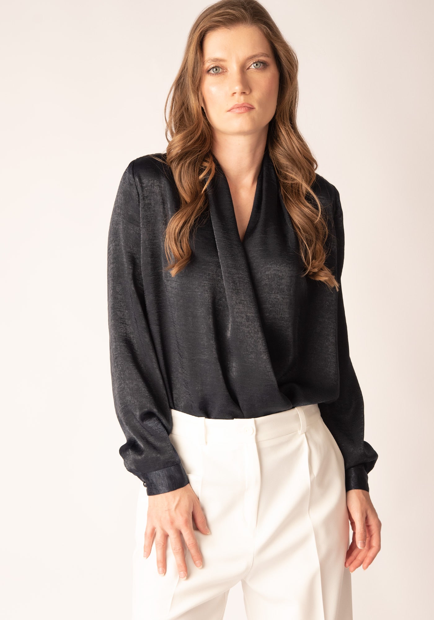Елегантна дамска риза- боди с изрязана долна част тип „танга“и свободен силует. Тип „прегърни ме“, без закопчаване. Изработена от мек сатен с копринен допир. За безупречен стил и комфорт без отваряне на деколтето се комбинира с долна част с висока талия.