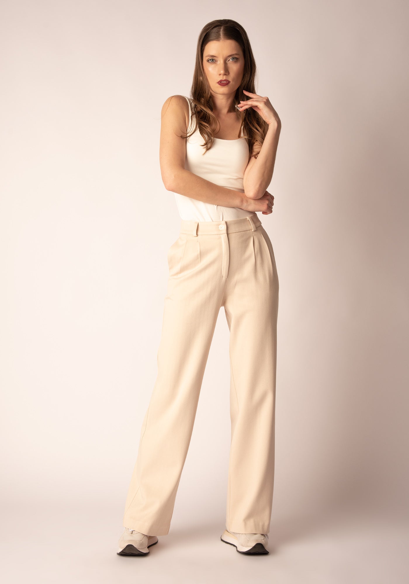 Дамски прав панталон с висока талия и басти. Изработен от плътна структурирана материя, този модел ще те стопли както в работно време, така и в ежедневието, а силуетът му ще ти осигури комфорт и красота през целия ден.