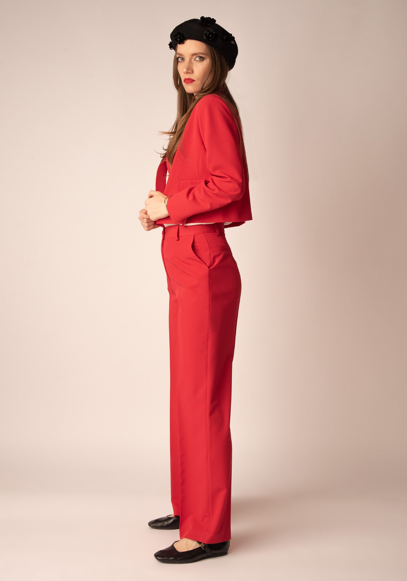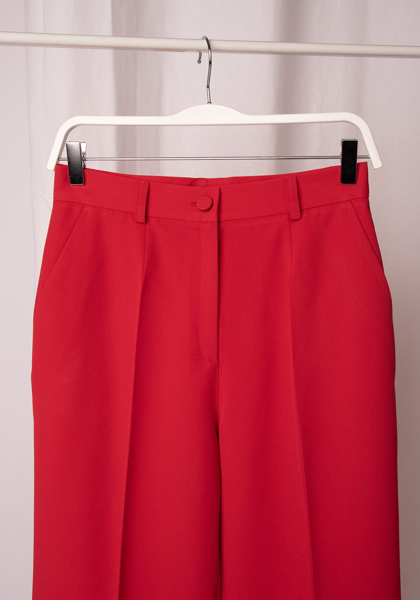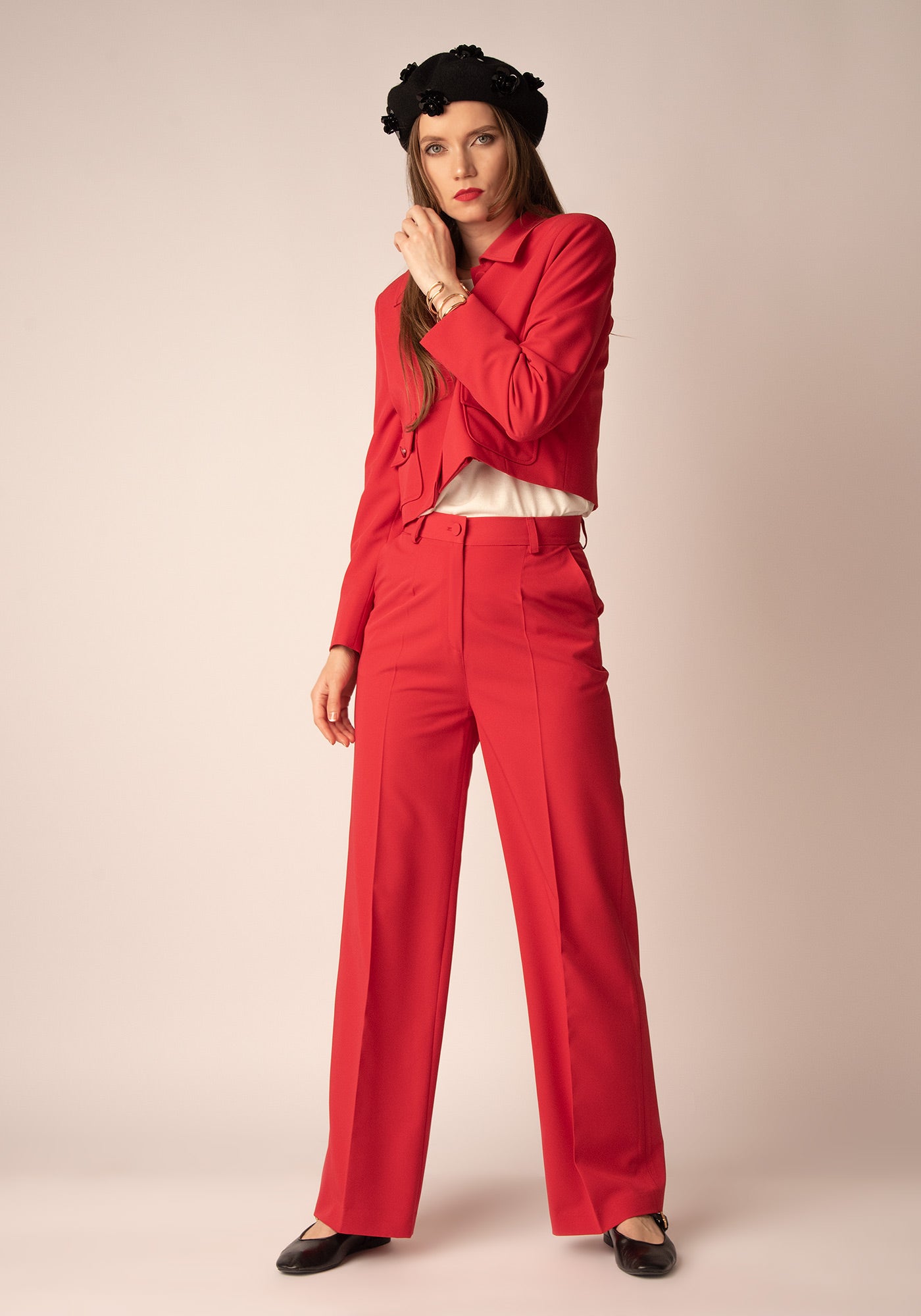 Дръзък, изчистен и винаги актуален – този червен панталон с висока талия е създаден да издължава фигурата и да придава увереност. С широк крачол, прецизен ръб и структуриран колан, моделът е едновременно класически и модерен. Изработен от гладка, леко еластична материя за максимален комфорт и изискана визия. Съчетай с късото сако от същата материя за завършен костюм с изразителен силует или комбинирай с риза и пуловер за стилен градски аутфит.