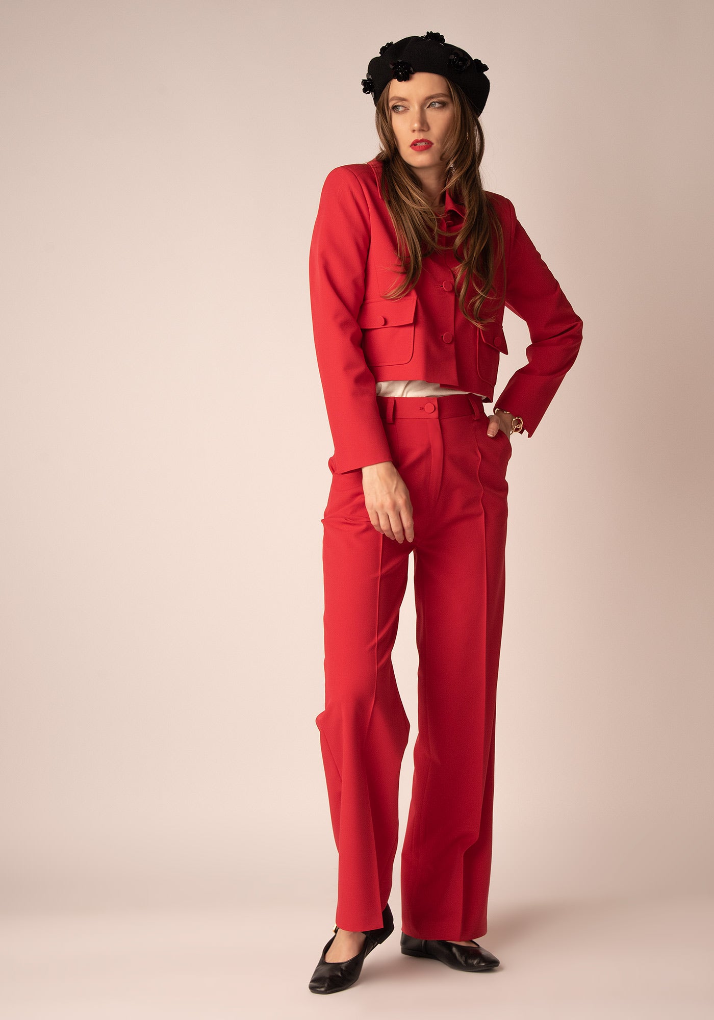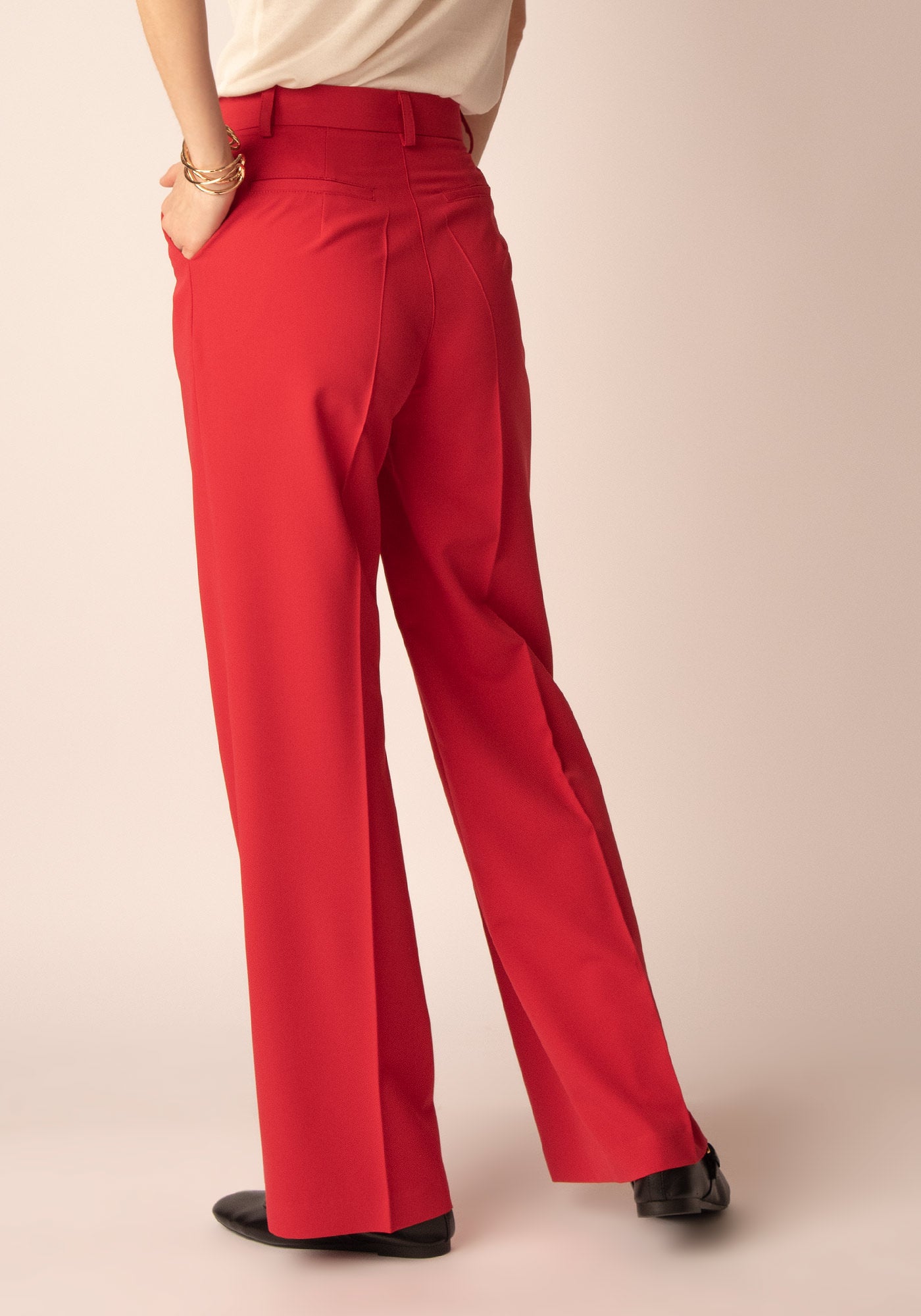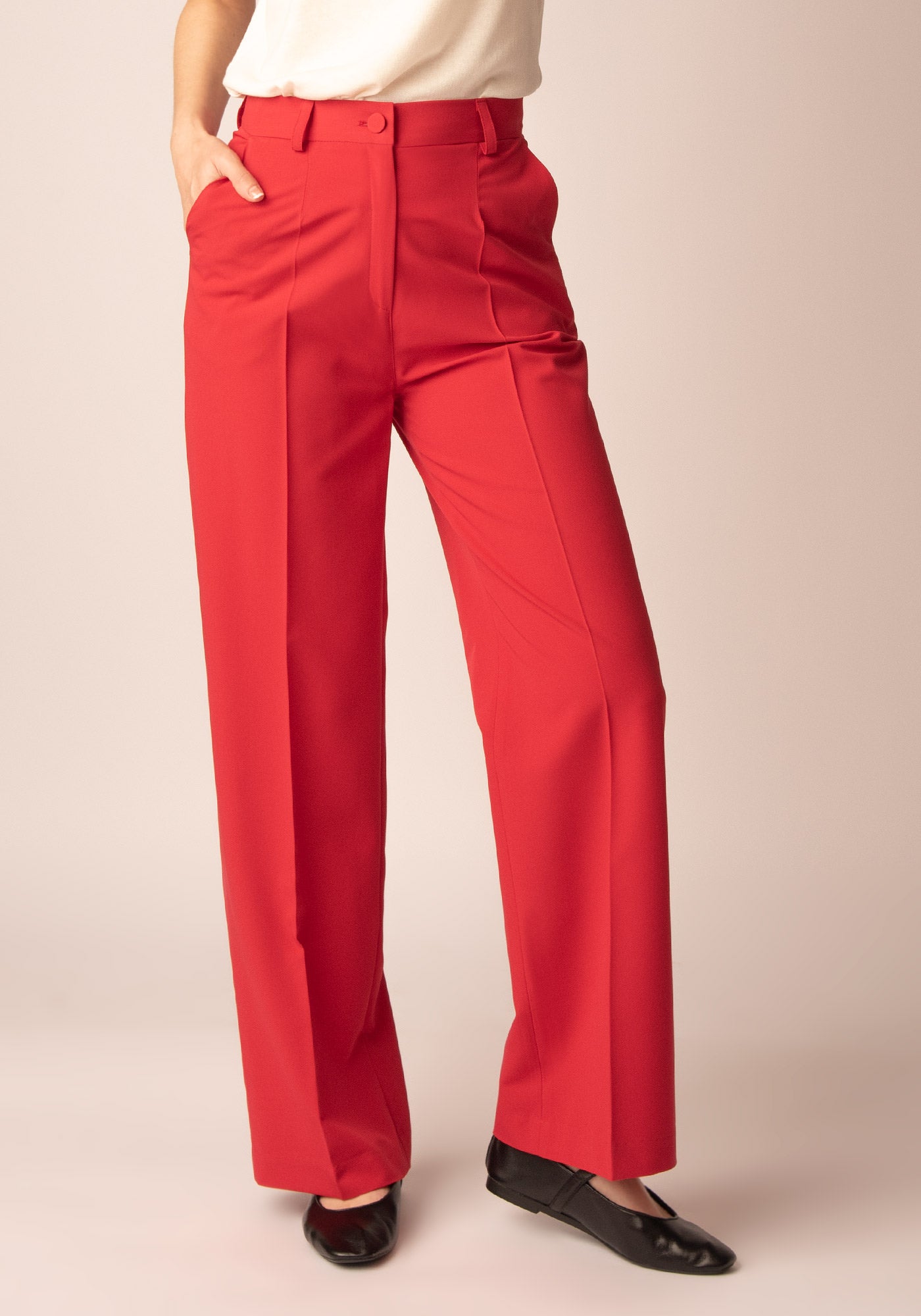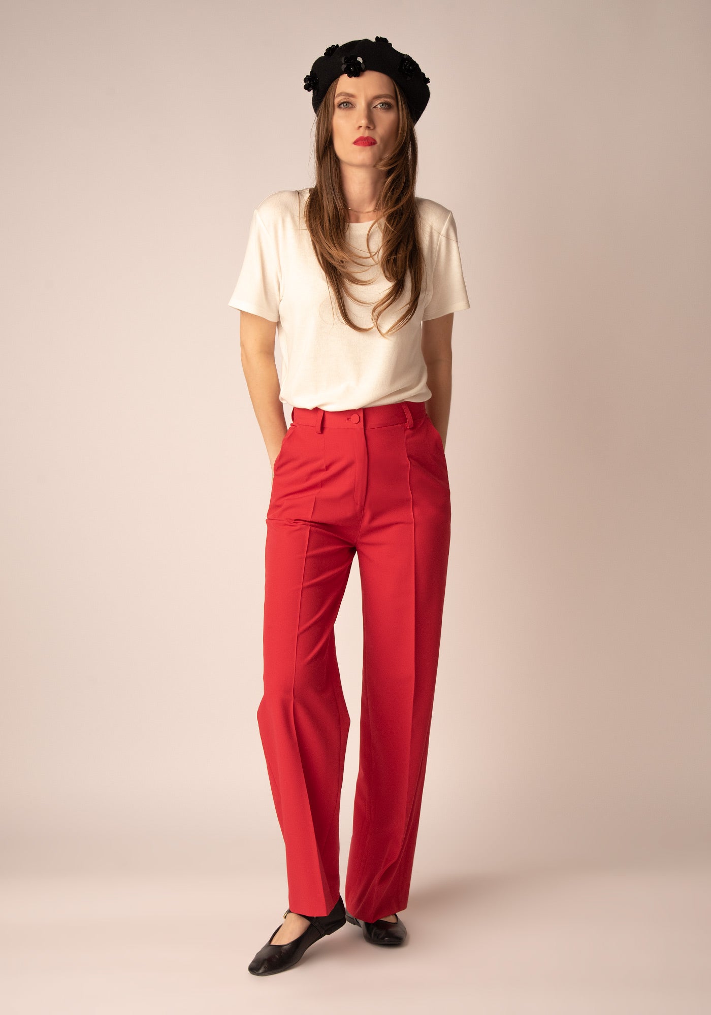Дръзък, изчистен и винаги актуален – този червен панталон с висока талия е създаден да издължава фигурата и да придава увереност. С широк крачол, прецизен ръб и структуриран колан, моделът е едновременно класически и модерен. Изработен от гладка, леко еластична материя за максимален комфорт и изискана визия. Съчетай с късото сако от същата материя за завършен костюм с изразителен силует или комбинирай с риза и пуловер за стилен градски аутфит.