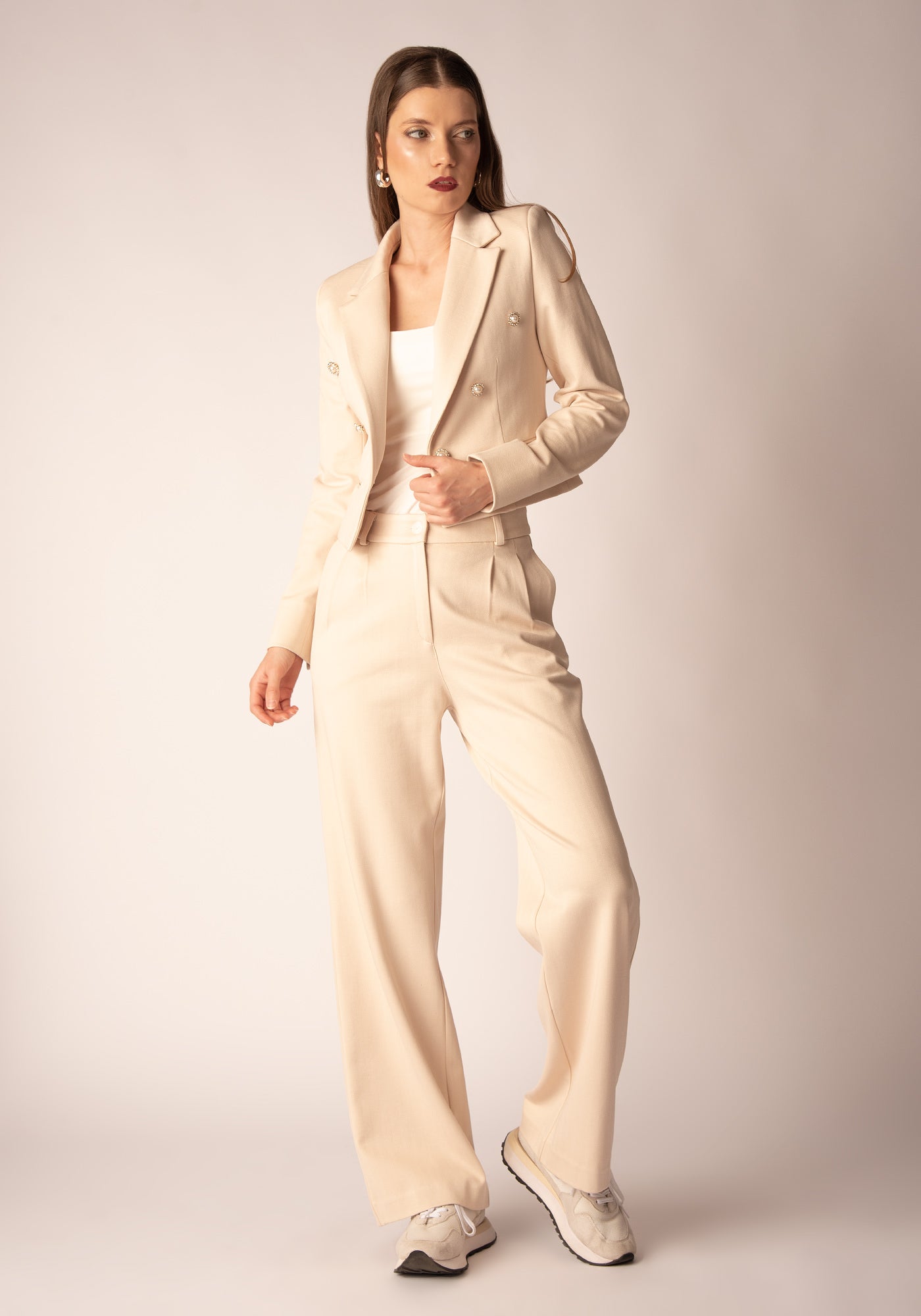Дамско сако с втален силует и скъсен дизайн. Изработено от плътна материя със структурирана плетка - рибена кост и напълно подхастарено. Придава елегантна линия на фигурата, а универсалният му цвят го прави лесно за съчетаване с ежедневни и официални модели. Перфектен избор за есенно- зимния сезон.