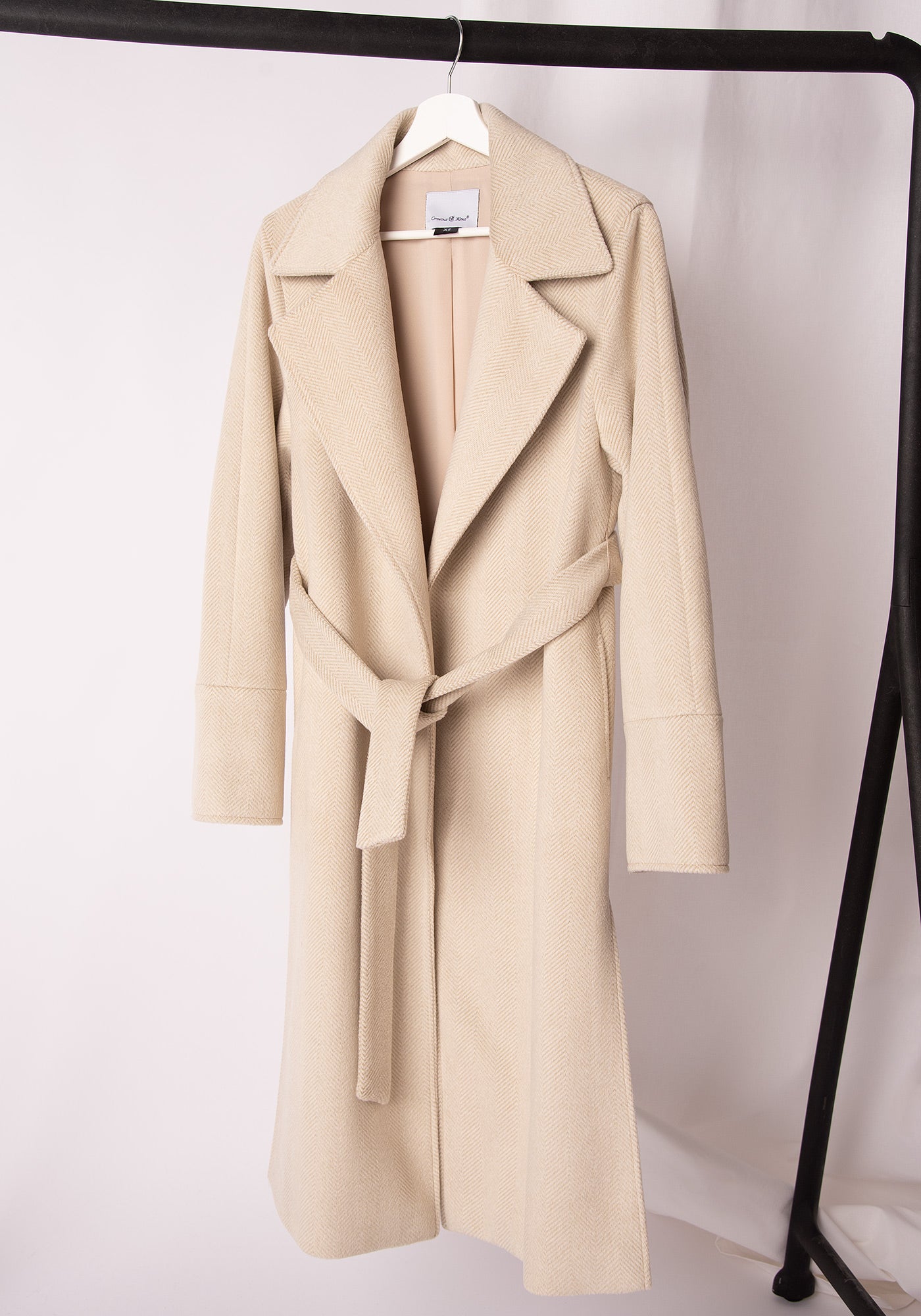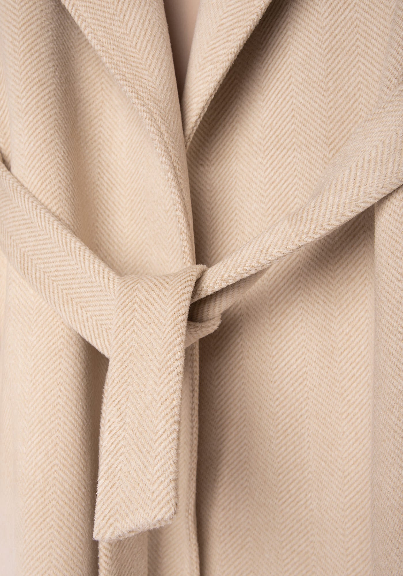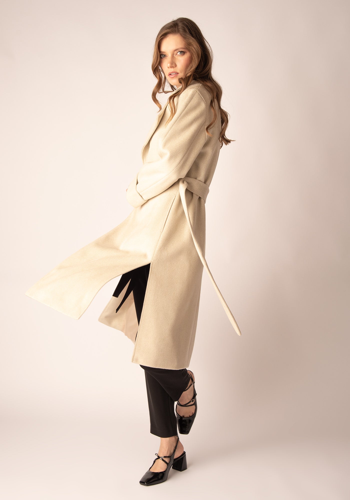 Дамско палто с дължина под коляното и цепки встрани. Със свободен силует и подвижен колан, пристягащ талията. Семпъл модел с изпипан универсален дизайн, който лесно се вписва в ежедневието ти за casual до runway inspired визия. Изработено от мека и плътна материя със съдържание на вълна и елегантен мотив - рибена кост. Има приятен допир до кожата със същевременно луксозно излъчване. Страничните цепки позволяват свобода на движението и грациозни стъпки.