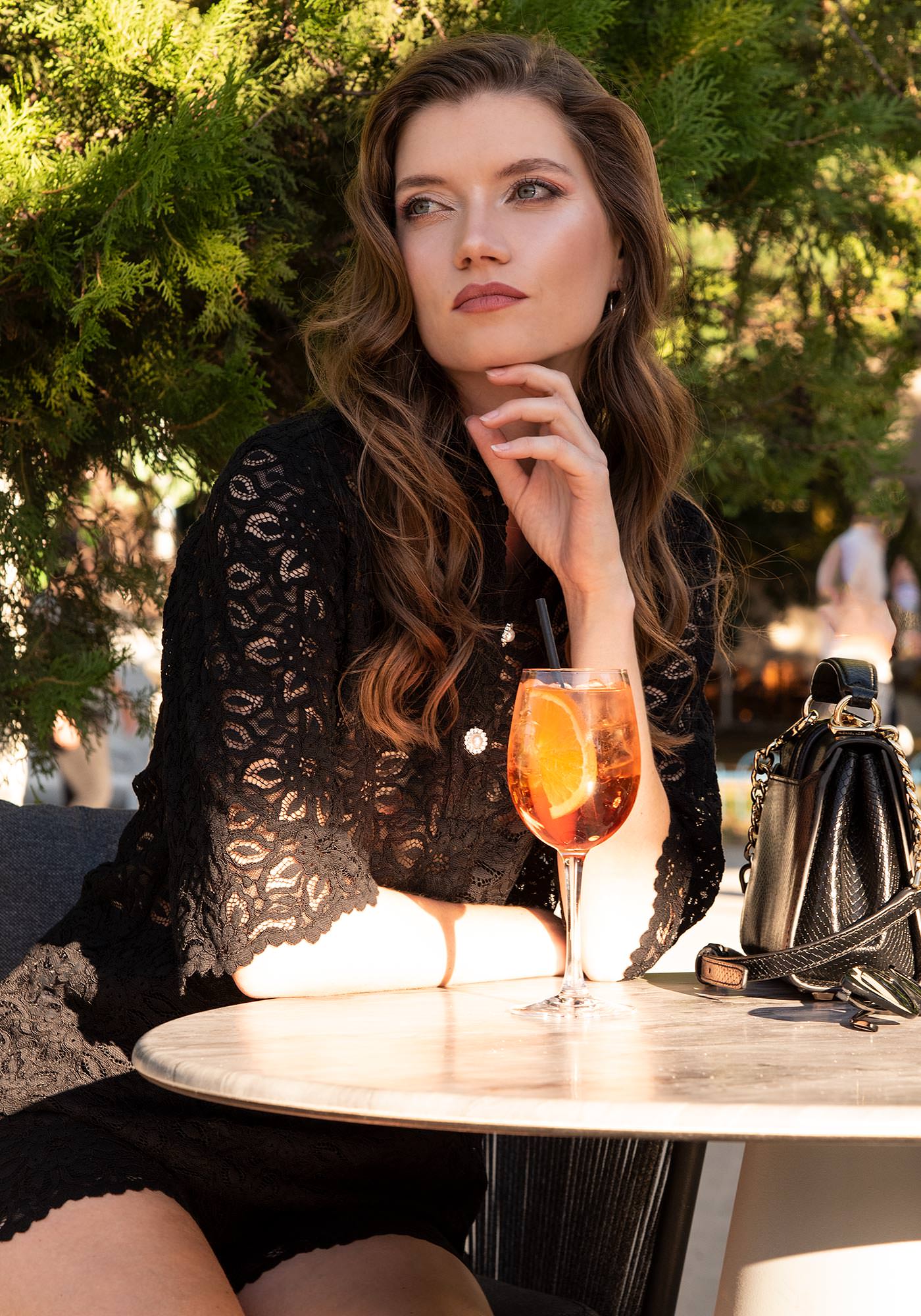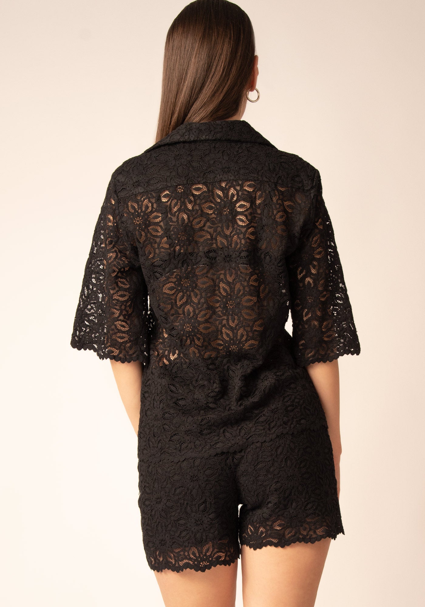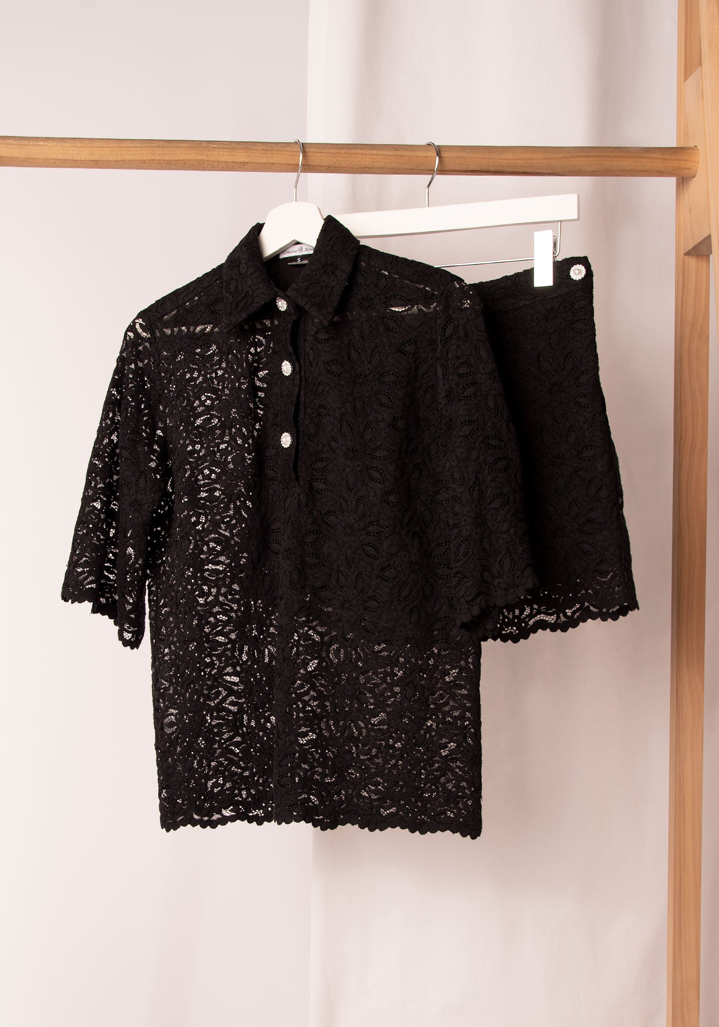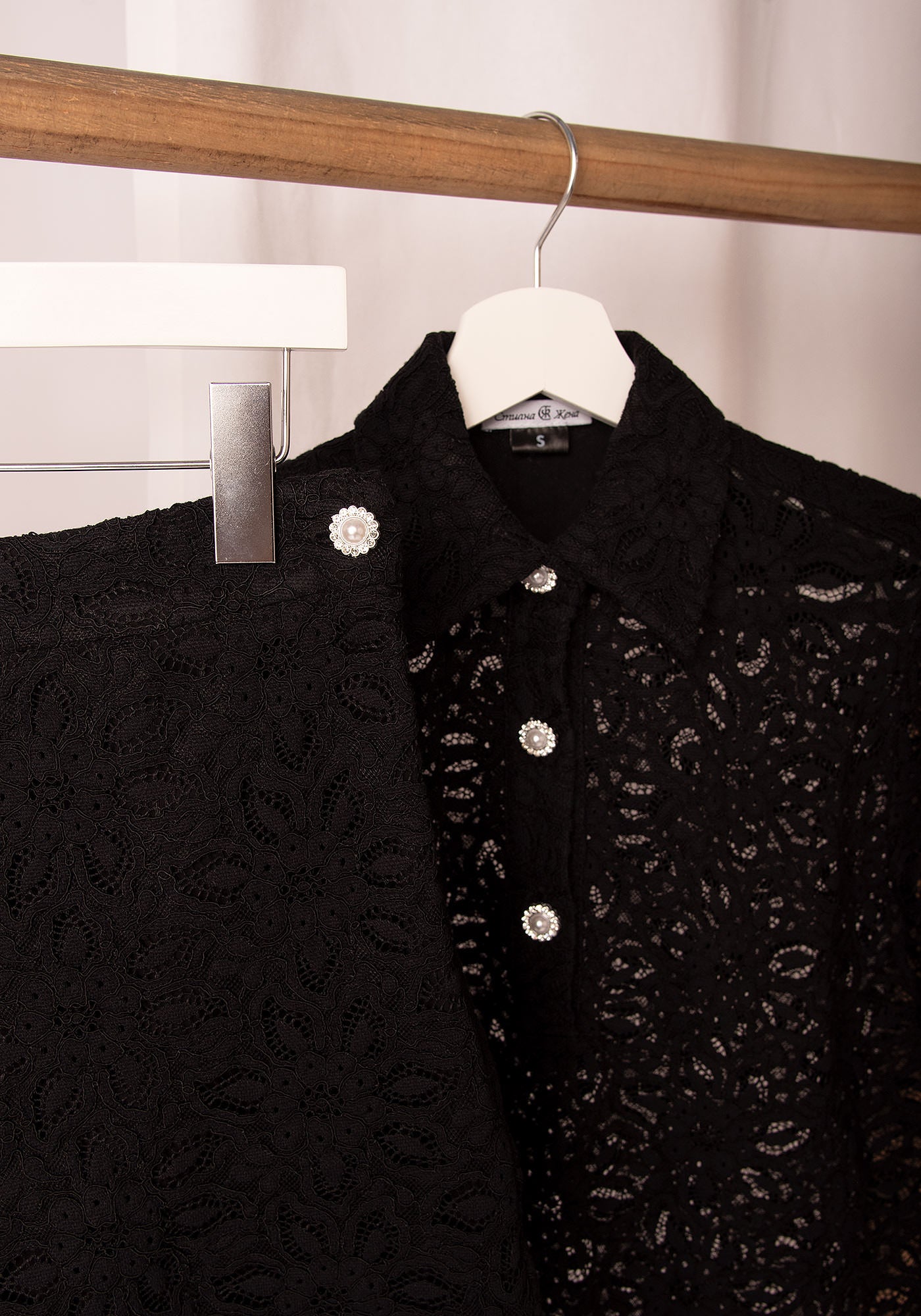 Тази Елегантна Дамска Блуза е изработена от луксозна дантела от Италия и завършена с красиви акцентиращи копчета. С малка яка, 3/4 ръкави и завършек от дантелен бордюр, тя е едно истинско модно бижу. Има модерен свободен силует и интригуваща женствена прозрачност. Добавете я към нашите Къси панталони от дантела за изящен тоалет за специални събития или като завършващ акцент към семпла долна част.