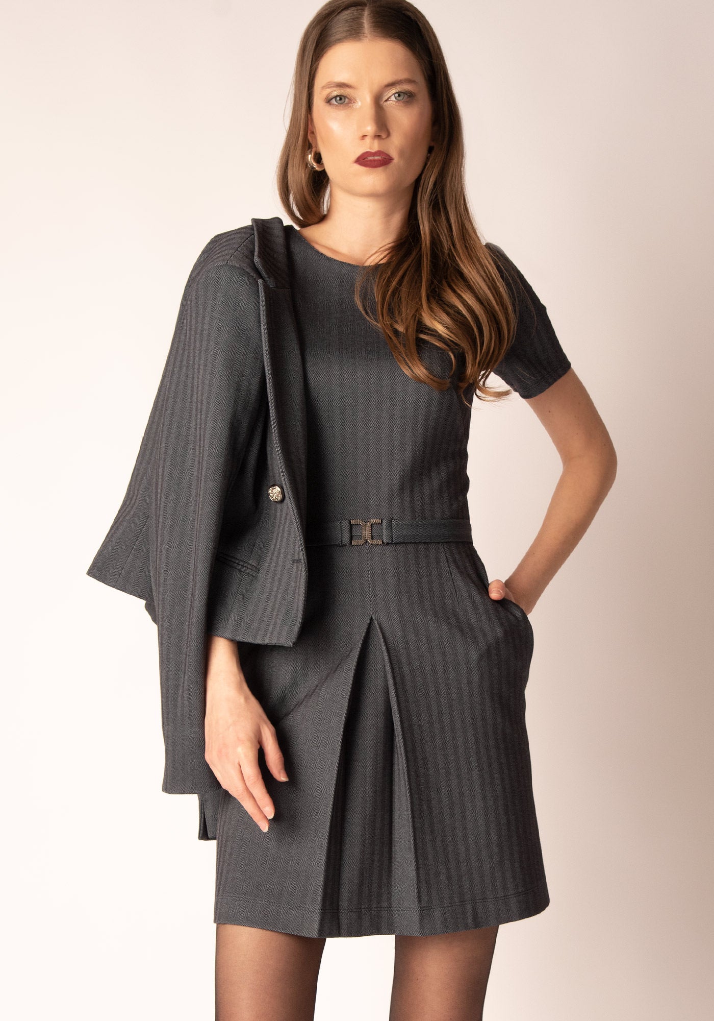 Тази мини рокля има вталена горна част и кокетен силует - трапец, с дълбока плоха и тънък колан с метална тока. Изработена е от плътна материя със структурирана плетка - рибена кост. Еластична, удобна и перфектна за сезона, можеш да я облечеш с повод или без и винаги да оставиш трайно впечатление.