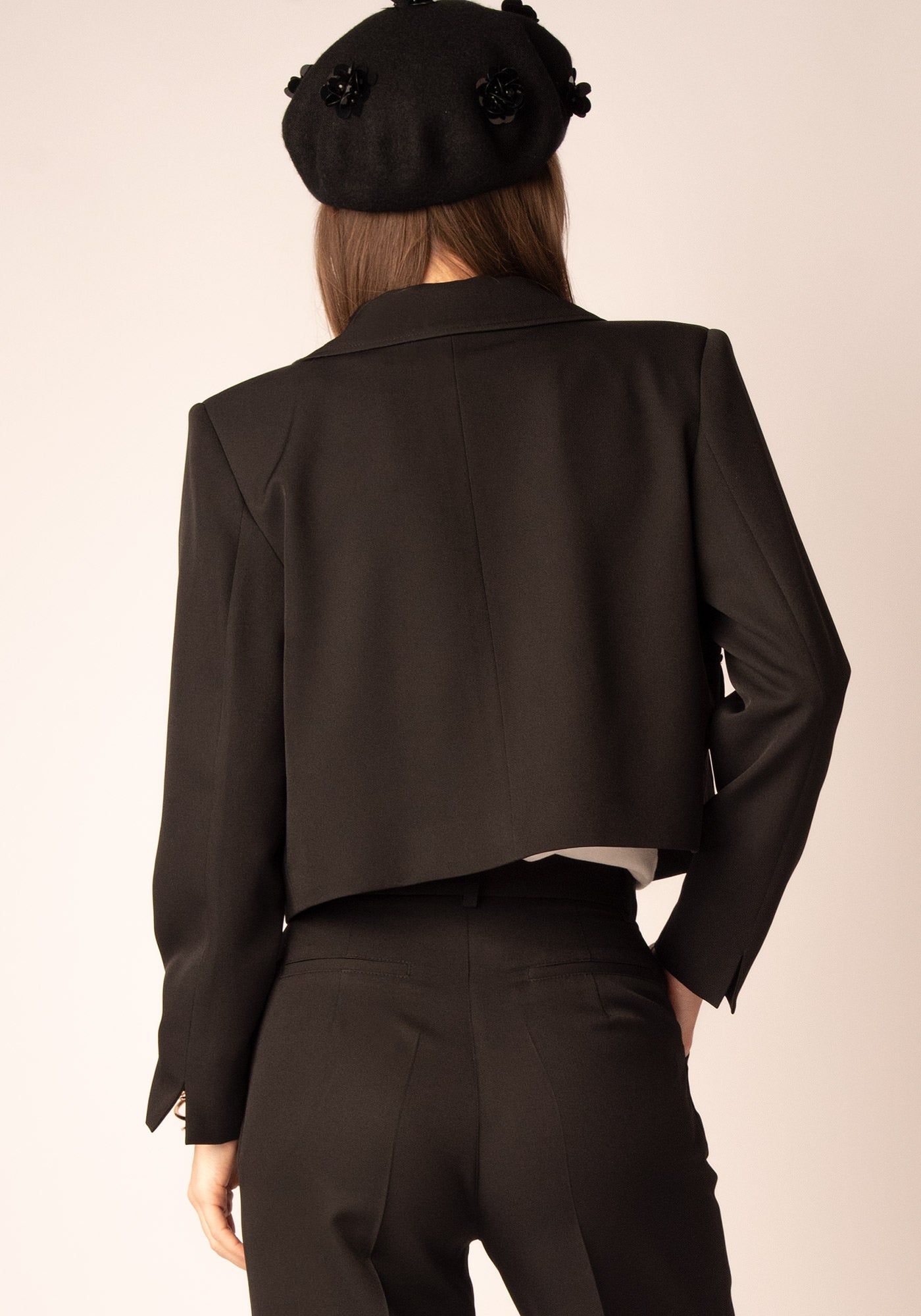 Изискано, модерно и с характер – това късо сако е акцентът, който преобразява визията. С облечени копчета, структурирани джобове с капак и яка, моделът съчетава класическа елегантност с модерен поглед към кройката. С леко скъсена дължина, сакото се комбинира перфектно с поли с висока талия или панталони, като добавя завършен и стилен силует. За завършена визия носи с нашия дълъг прав панталон от същата материя.