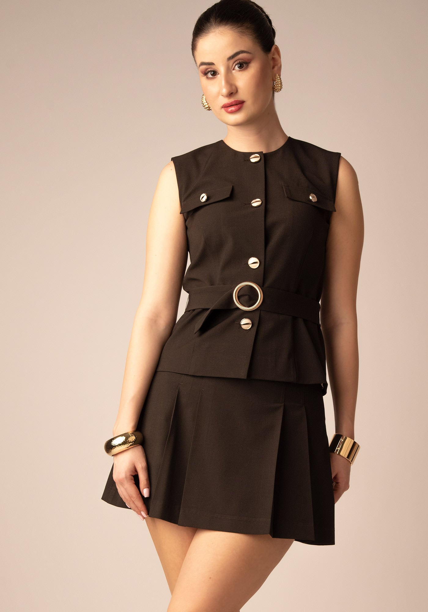 Стилна и закачлива – тази мини пола с плисета е изработена от висококачествена италианска студена вълна, която придава елегантна структура и комфорт. С изчистен колан и ефирно движение, моделът е идеален избор за ежедневието с изискан щрих. Комбинирай с подходящия елек за цялостна визия или носи с пуловер за по-небрежен стил.