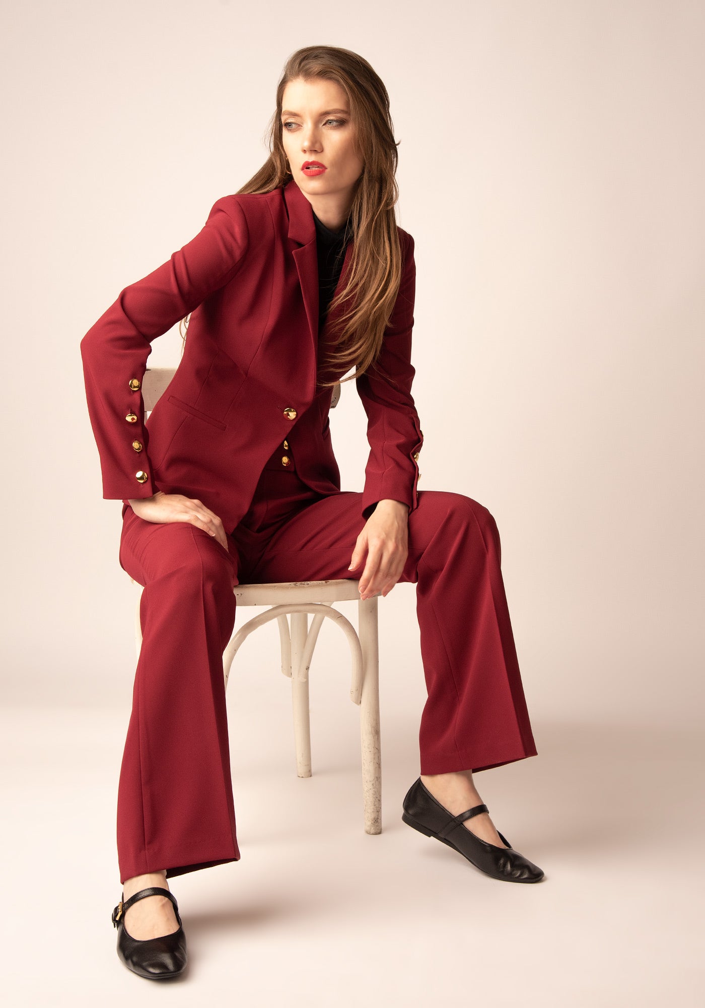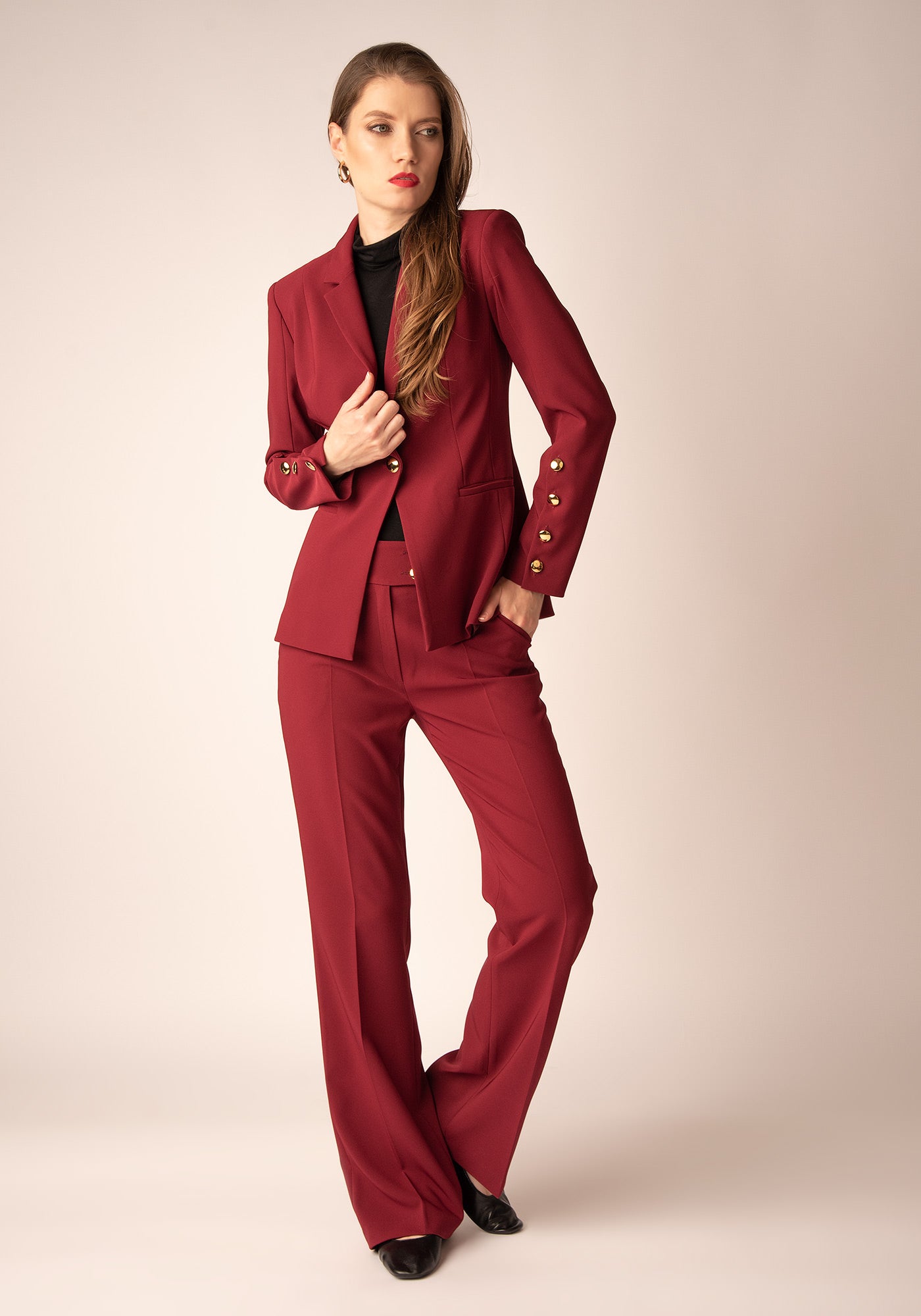 Елегантен, изчистен и създаден да подчертава силуета – този елегантен панталон е перфектното допълнение към вталения блейзер от същата материя. Изработен от гладка леко еластична материя, панталонът предлага комфорт и кройка, подходящи както за офиса, така и за специални поводи. Класическато разкрояване с пригладен ръб и златисти копчета на колана добавят луксозен акцент, а дължината подчертава краката и визуално издължава фигурата.