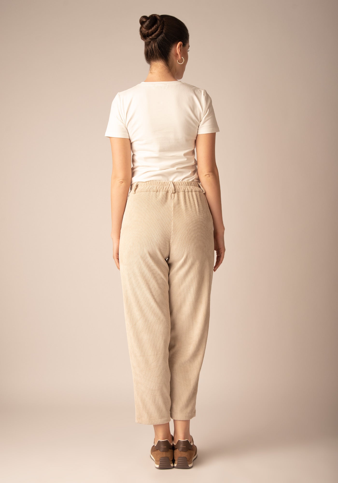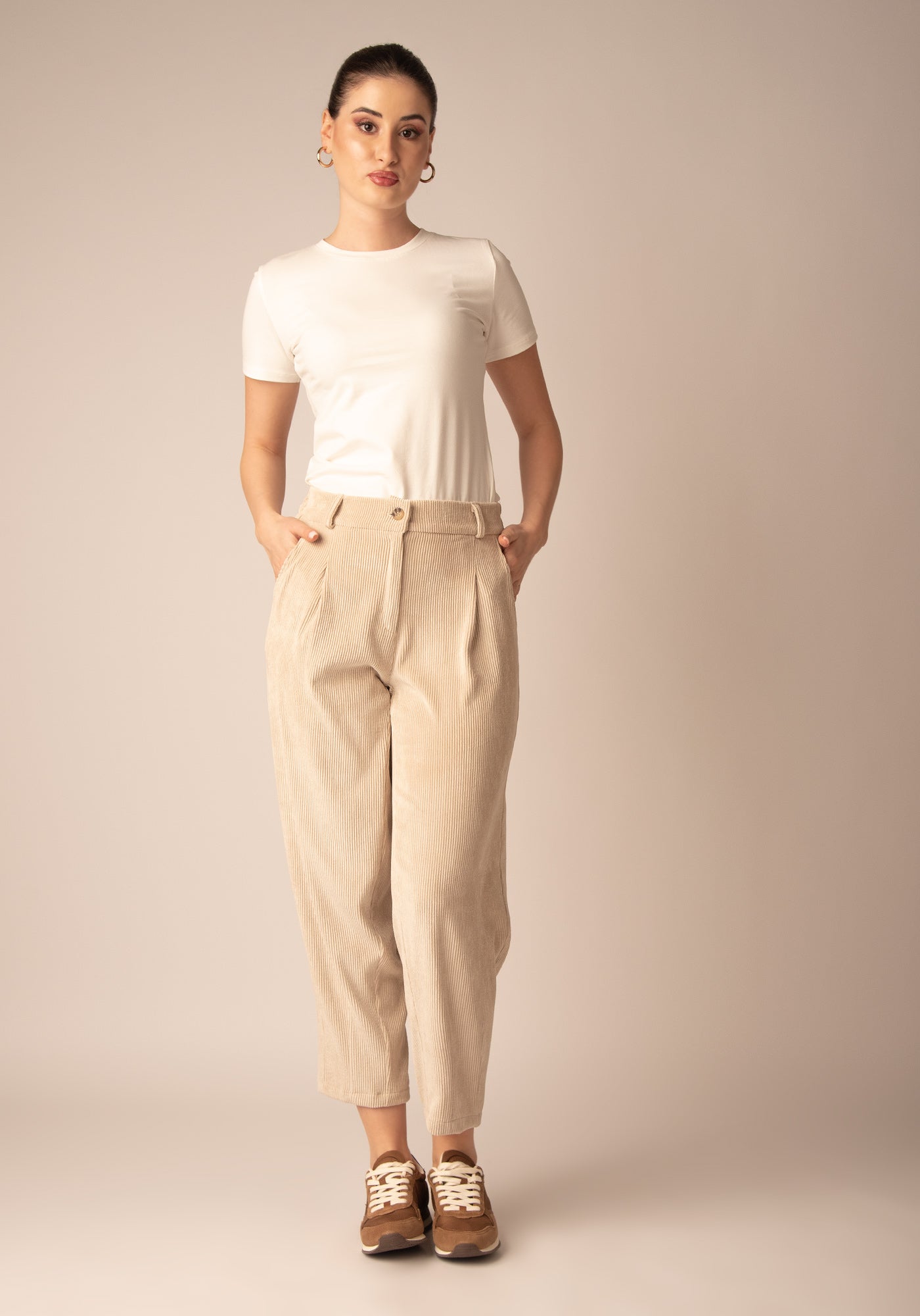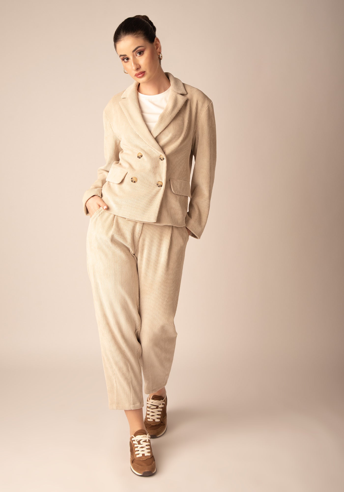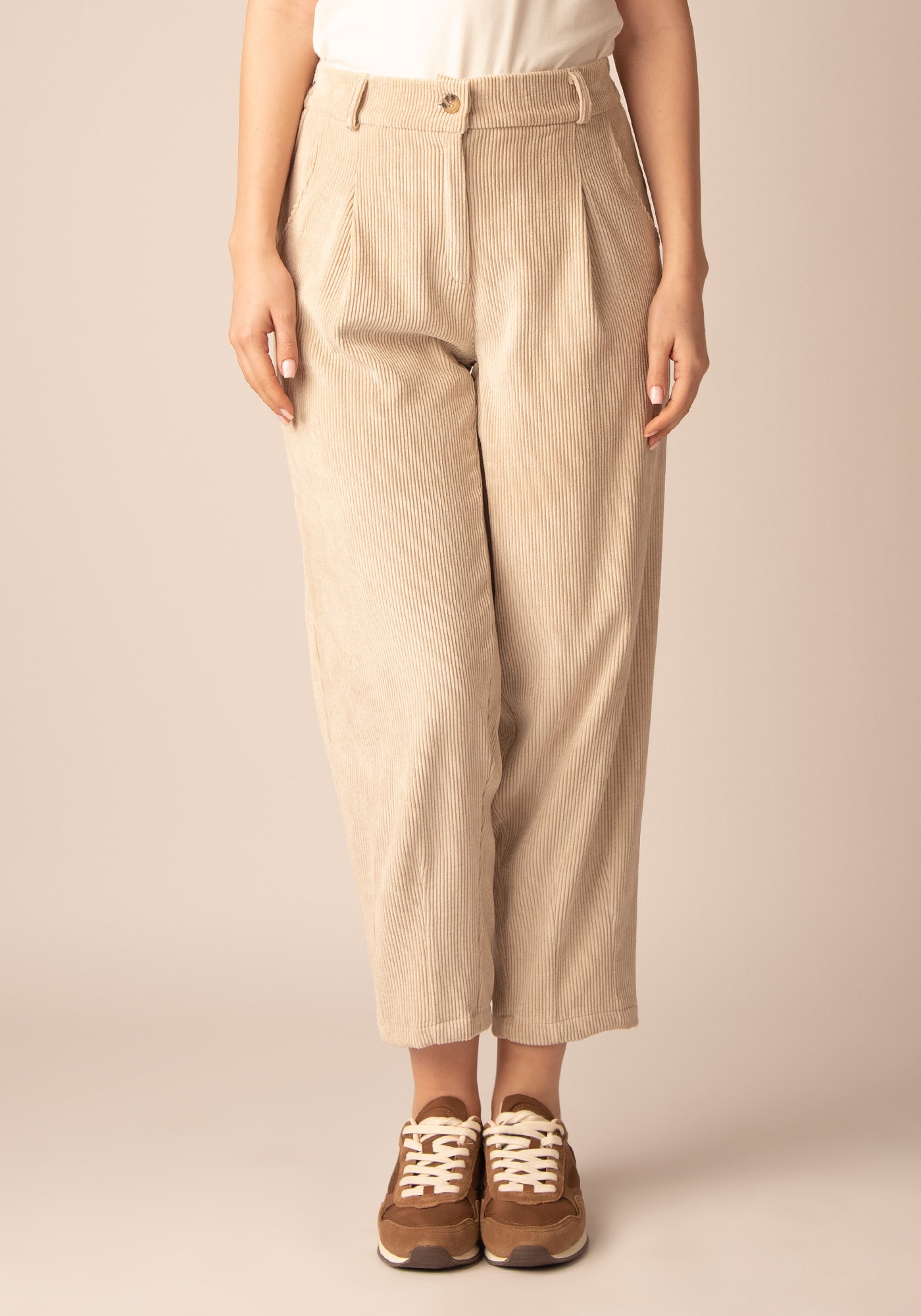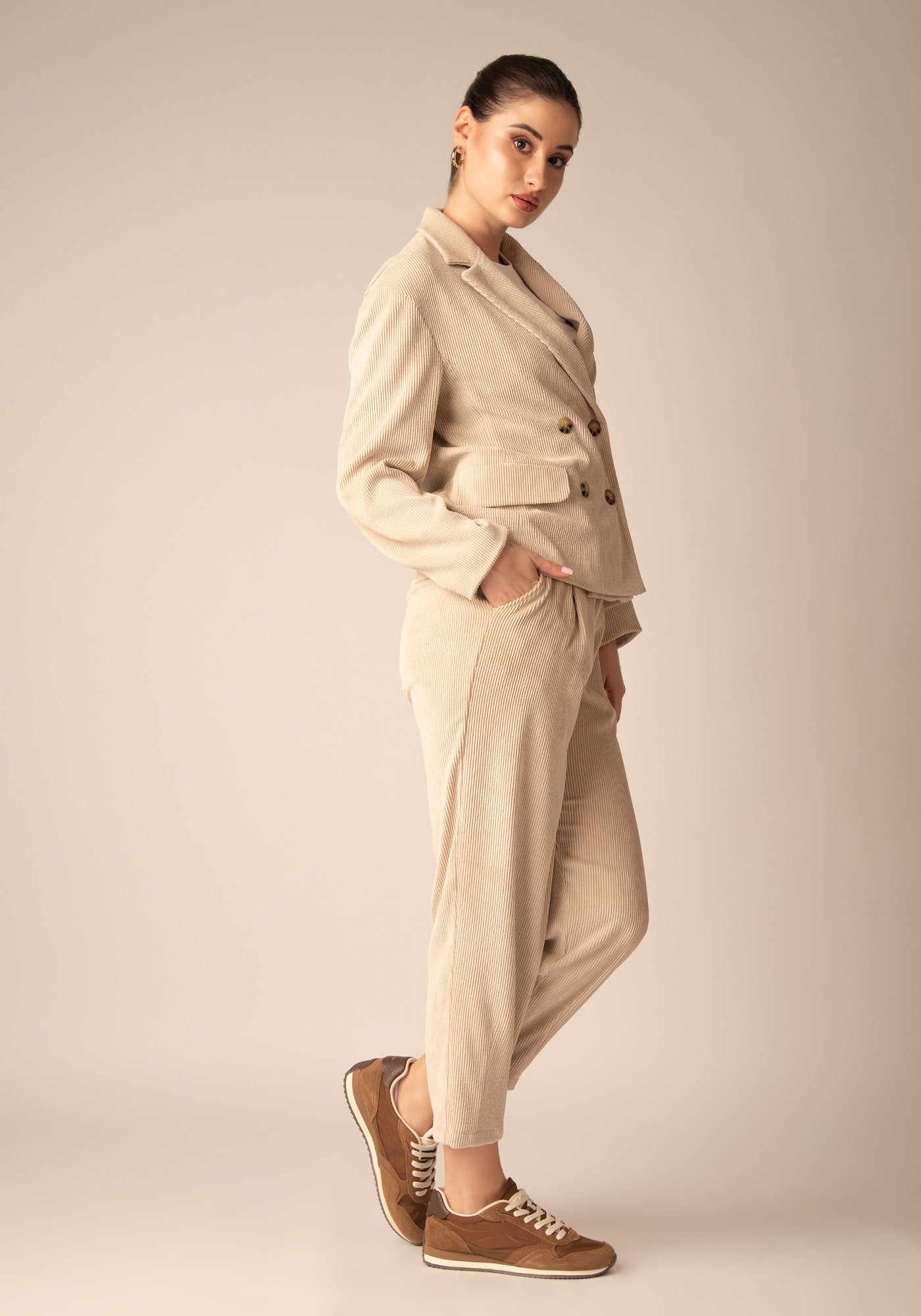 Тези кадифени панталони са изработени от мека памучна смес, която осигурява комфорт, устойчивост и приятна текстура. Свободната кройка създава модерна и непринудена линия, подходяща за динамичното ежедневие. Финият кадифен релеф придава стилен ретро чар. Моделът е идеален за ежедневни и smart-casual визии, като лесно се комбинира с ризи, плетива или блейзерът от същата материя за завършен вид.