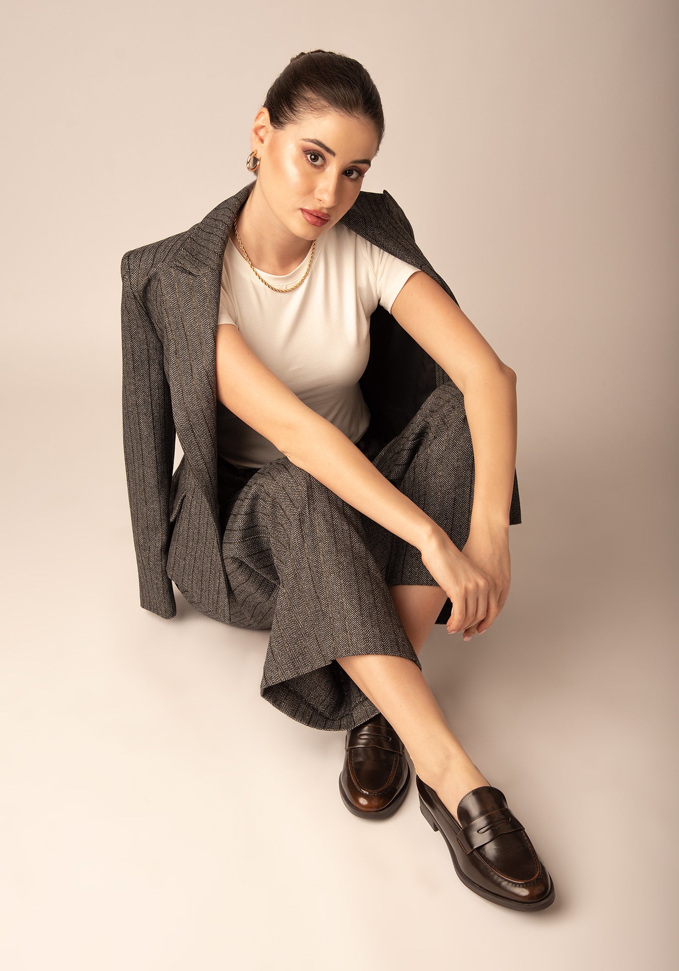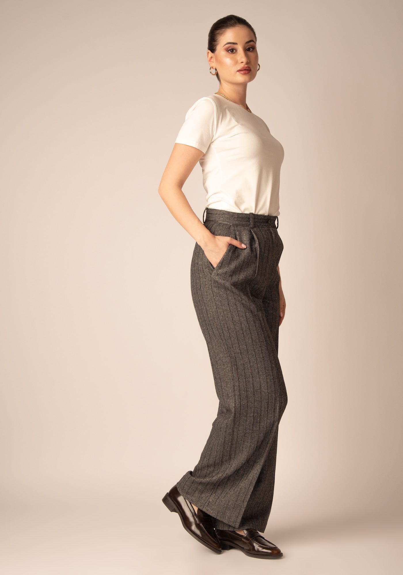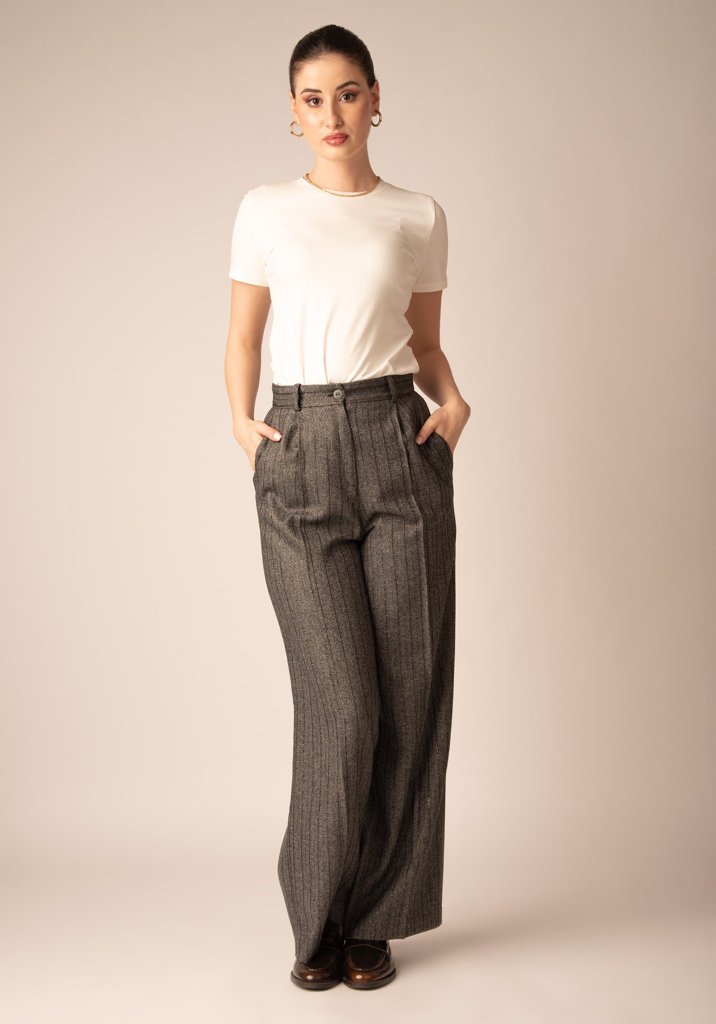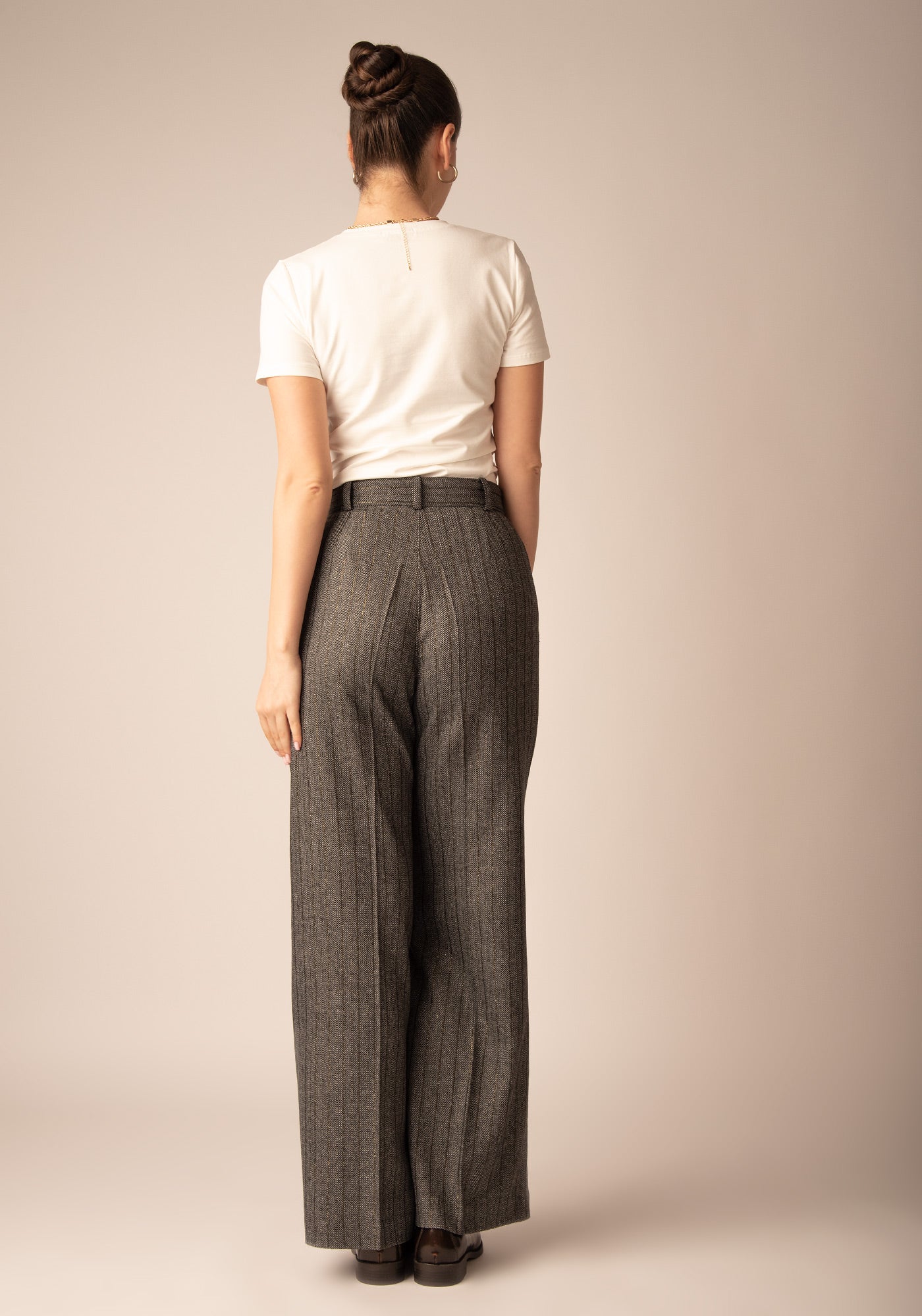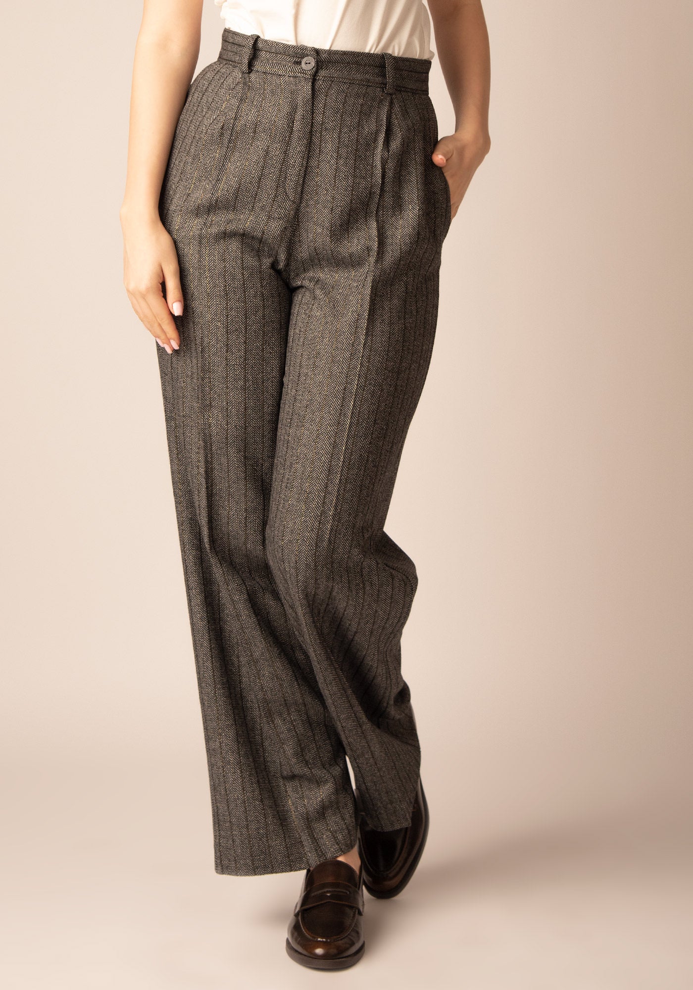 Тези широки панталони са изработени от висококачествен вълнен микс, с класически десен - рибена кост, допълнен от фина метална нишка със златист блясък. Свободният, удължен силует придава елегантност и комфорт, а прецизната кройка оформя изчистена и стилна линия. Моделът е подходящ за модерни офис визии и изискани ежедневни поводи. Съчетава се отлично с ризи, фино плетиво или съответстващо сако за завършен и хармоничен аутфит.